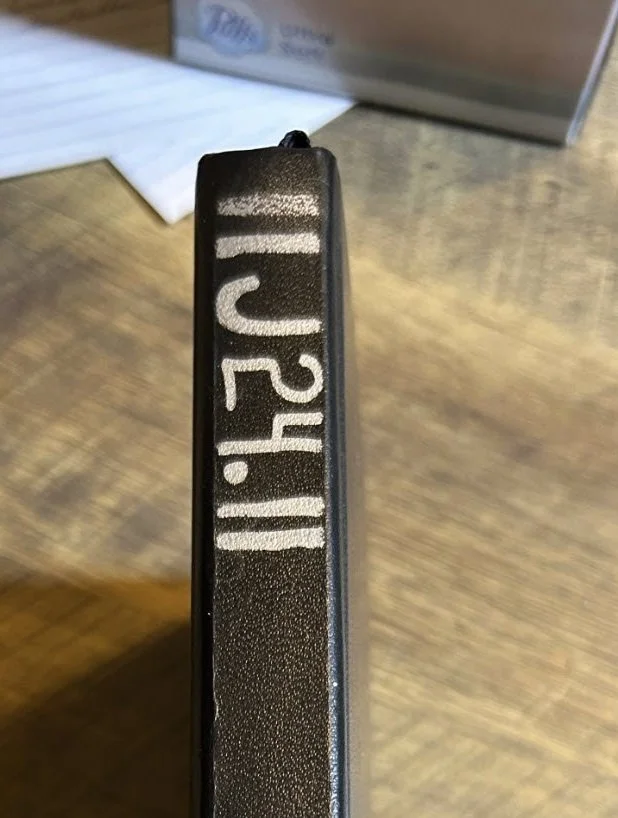 Here’s the binding of the journal I started on 11/19/24. Note the order of the numbers on the binding (Be careful. I have taken to making two straight lines at the top of my journals and I’m not sure why. I think it must be because I decided it looks better. Unfortunately, it also makes it look like there’s an 11 at the top. Just ignore those two lines).