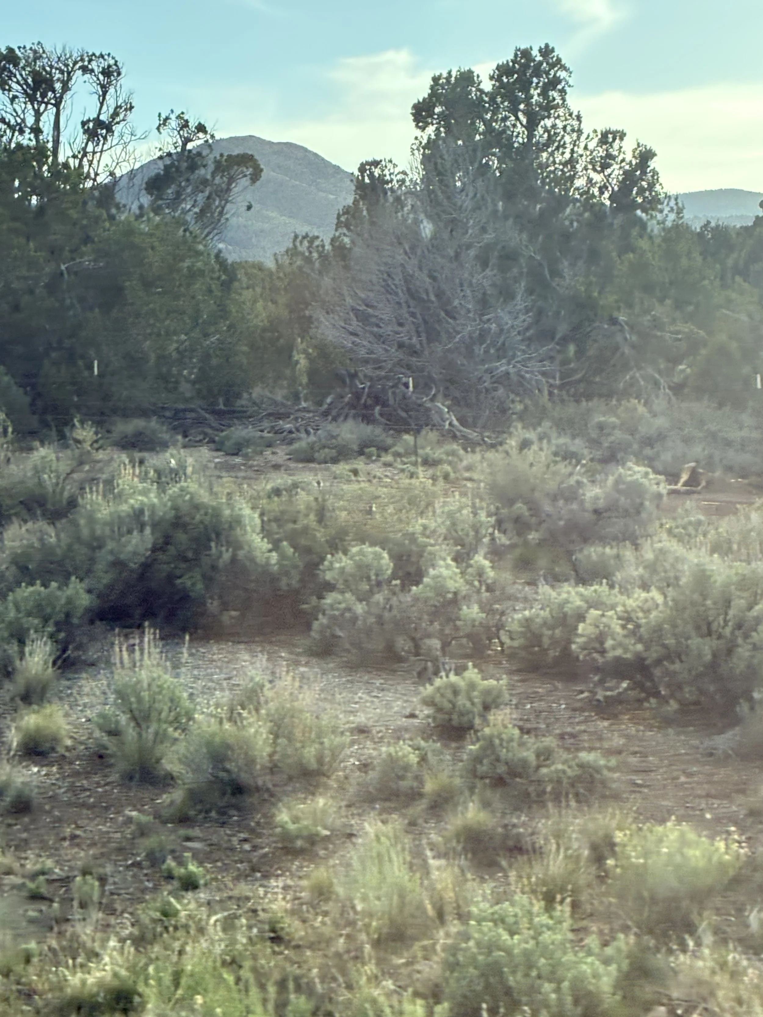 Most of the landscape was very “scrubby.” This part has some trees, but there were lots of flat, scrubby plains with no trees. We did see a lot of hills, and yesterday the road climbed and climbed. We drove along some beautiful snow-topped mountains, too.