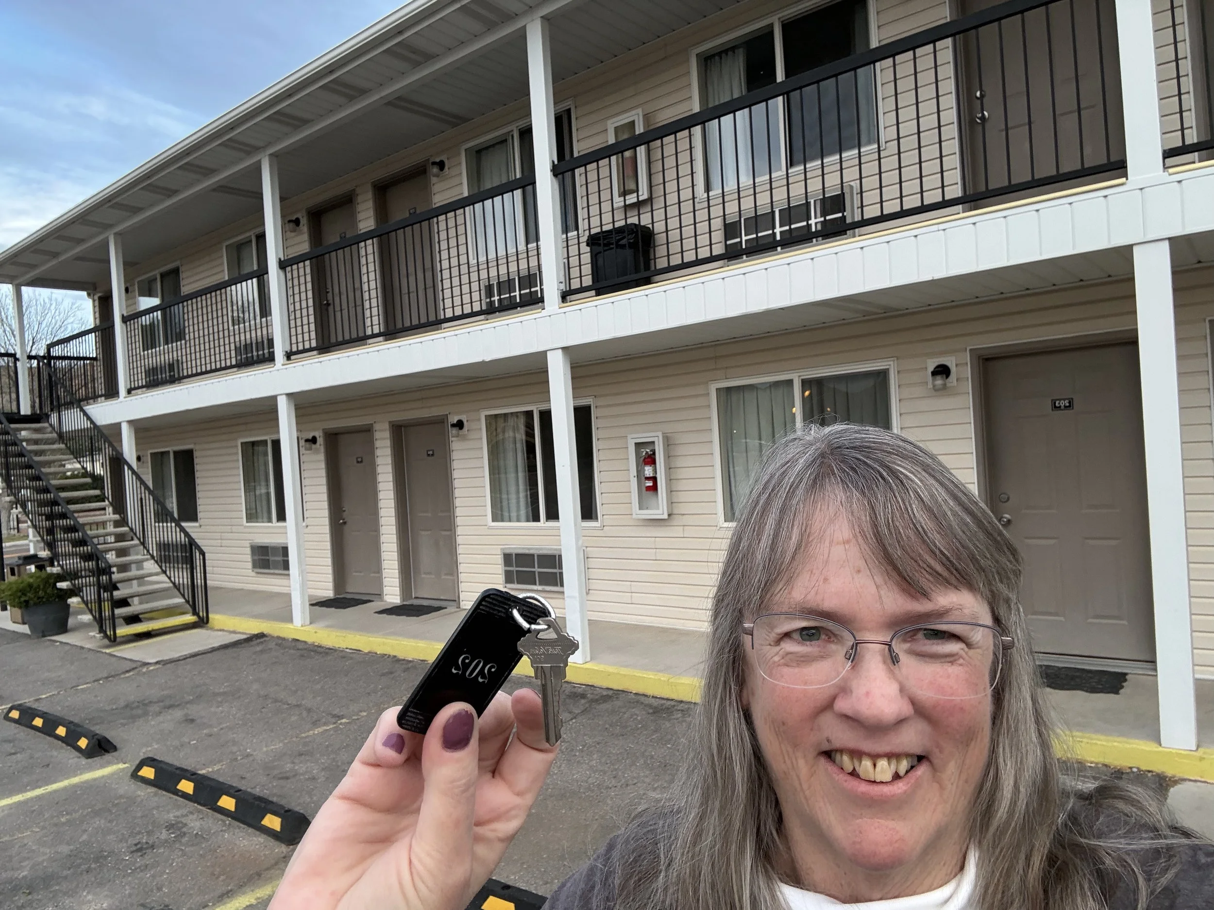The motel has an old fashioned key for the door. No USB ports in the room. It does have WiFi, though. :)