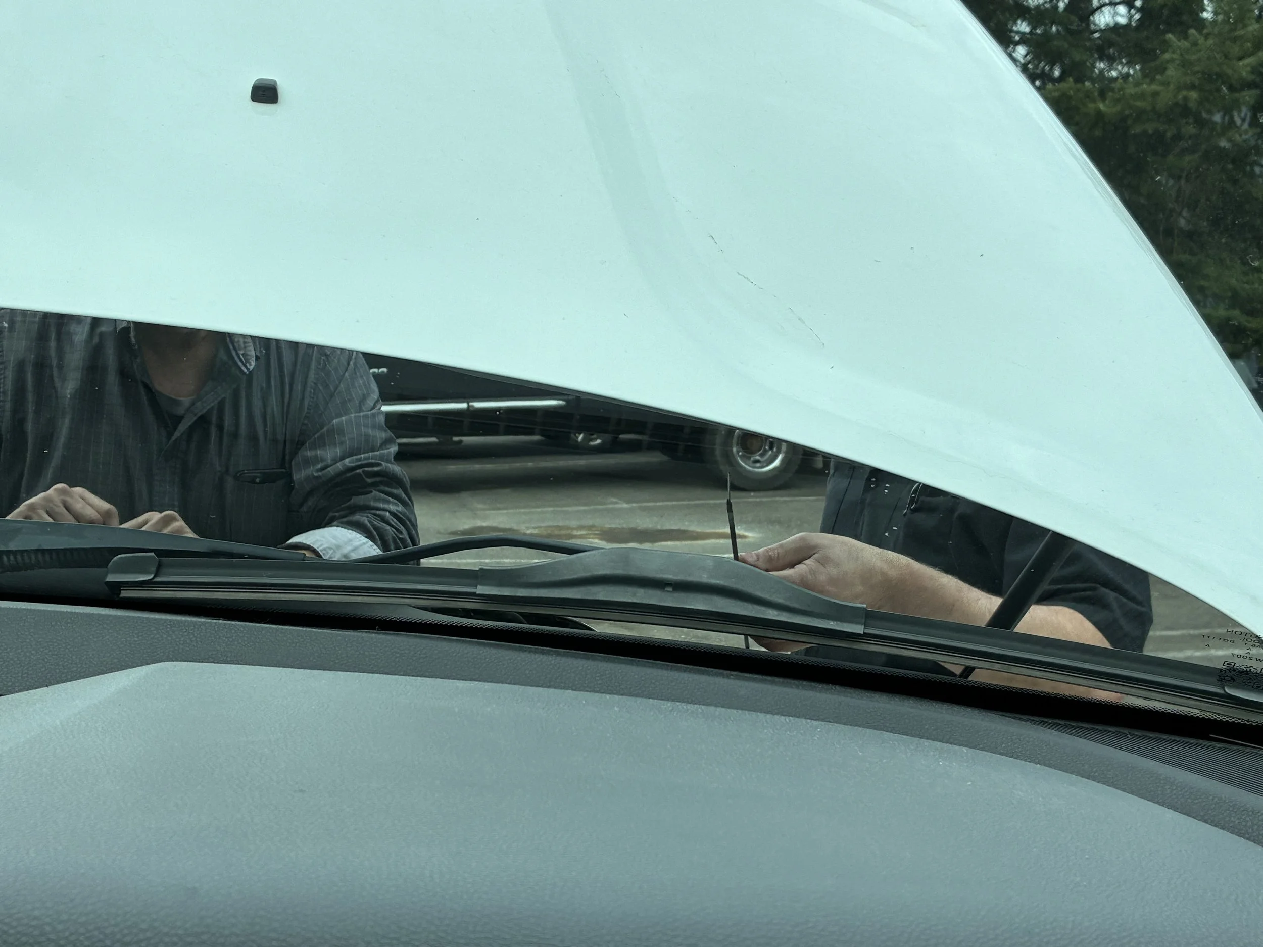 Well, this (above) is the view of the end of the first beginning of our trip. We got all packed up and left around 6:30 am yesterday (Friday). We were happily listening to “The Rest is History” podcast, munching cookies and oranges, when we heard a beep. Never a good thing. The check engine light went on. Then, when the gear shifted, the truck kind of jumped and bumped. Then it began to heat up. Then it struggled to go, the RPMs ratcheting up while we barely moved. Randy took an exit that turned out to be Kirkland. He talked to someone at a gas station across the street from where we found space to park, and they directed us to a transmission shop a few minutes away. When we parked, he had turned off the truck, and when we started again, things seemed pretty much normal—no light, no bumping, etc. At the transmission shop, the guy said he couldn’t do anything for a week. We were only a few hours away from Lynden, so back we went.