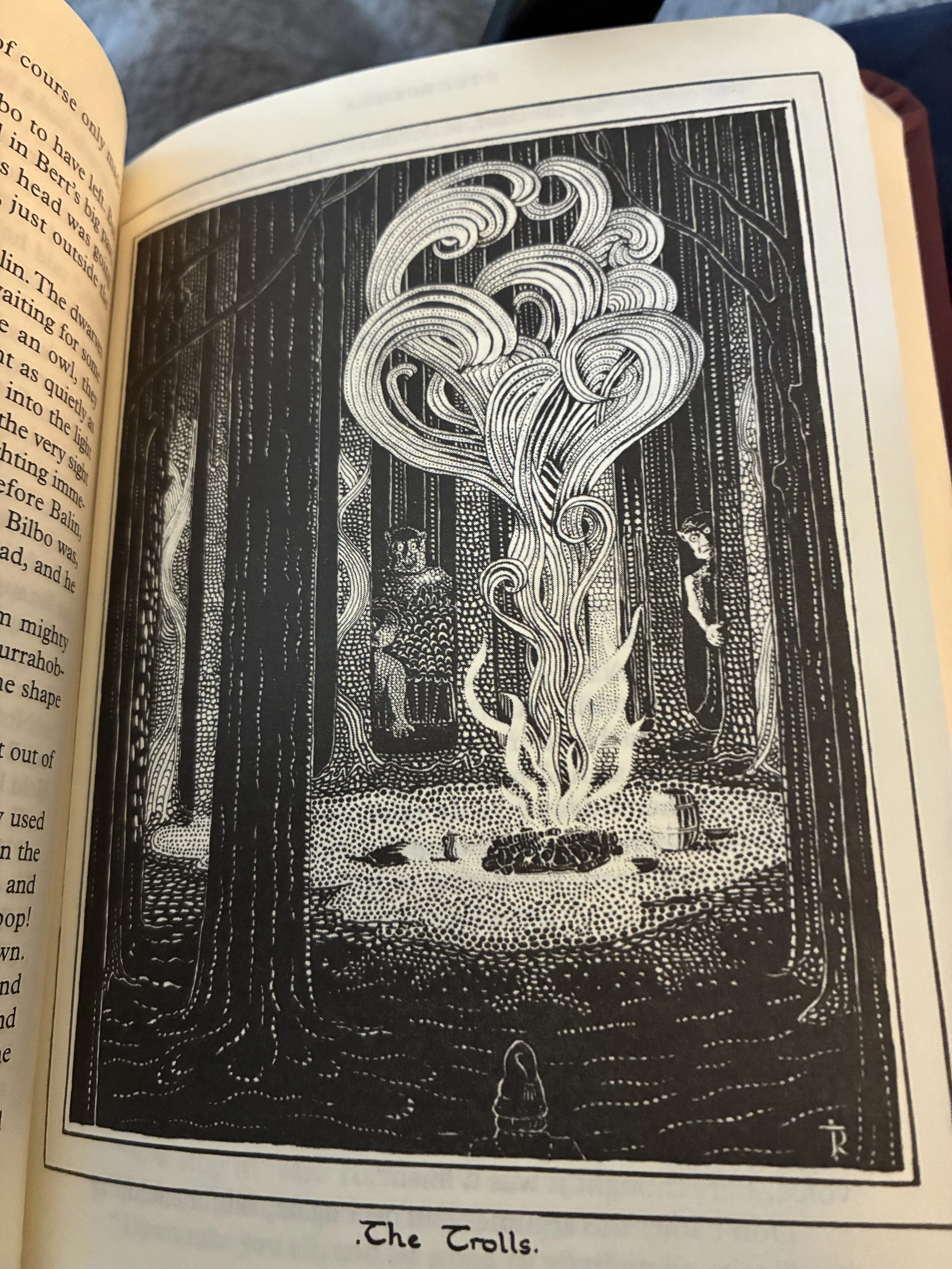 To comfort myself, I am visiting Middle Earth by reading The Hobbit and The Lord of the Rings trilogy. I haven’t read them for several years because I’ve been in mourning over my beloved hardcover editions, which I read and re-read since I was a kid. Somehow, in the remodel of our San Jose house, I lost that set. I tried to buy the same set again, but I cannot find it, even on rare and out-of-print sites. The ones I see are too new. They have illustrations from the movies. I liked the movies, but I love the old illustrations from the editions I had, which seemed to be Second Editions, based on the copyright page. I purchased a nice leather-bound set with the “right” illustrations, but they are quite small. I couldn’t bring myself to read them until now, when the ache of my grief is less. (I know, grief about books is pretty weird.)