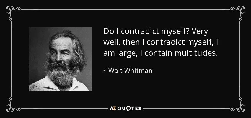 This line—”I contain multitudes”—keeps coming to my mind. I am intrigued by the contradictions of myself and others. There are so many people I admire, who I think of as heroes, yet nearly all of them have said or done things that are disappointing or worse, and seem out of character with their heroic deeds.